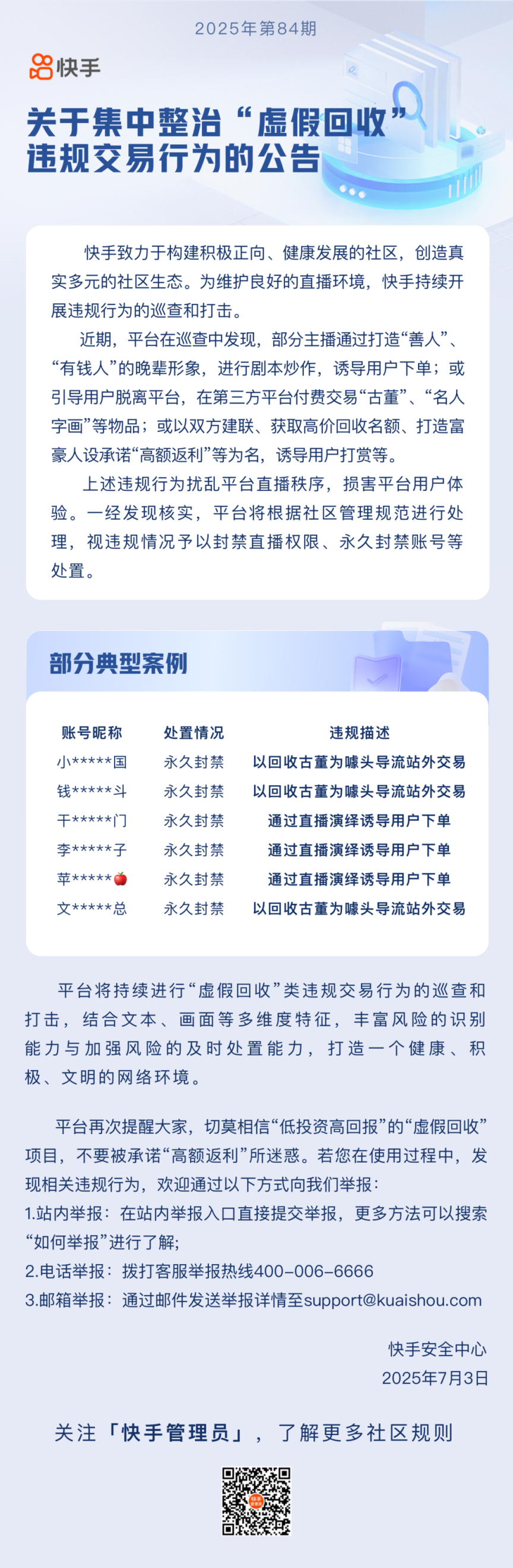 银易配资网 集中整治“虚假回收”违规交易行为!快手提醒用户
